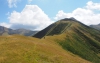 Kontynuujemy naszą wędrówkę wzdłuż olbryzmiej połoniny w kierunku na zachód, cały czas ściśle granią. Przy dobrej pogodzie będziemy mogli podziwiać najwyższe szczyty tej okolicy: Kazbeka i Tebulo.