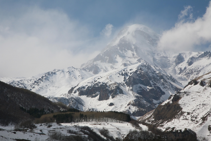 Kazbek (gruz.: მყინვარწვერი, Mkinwarcweri - Lodowy Szczyt) – jeden z najwyższych szczytów Gruzji o wysokości 5047 m n.p.m., położony we wschodniej części centralnego Kaukazu, na granicy z Północną Osetią. Kazbek leży w Paśmie Bocznym Wielkiego Kaukazu, podobnie jak Elbrus (5642 m n.p.m.) oraz Tebulosmta (4492 m n.p.m.). Pierwszego wejścia dokonali w 1868 roku D. W. Freshfield, A. W. Moore, i C. Tucker. Jest drzemiącym wulkanem zbudowanym z law trachitowych. Ostatnie erupcje miały miejsce około 6 tys. lat temu. Pozostałością po działalności wulkanicznej są dziś wyziewy gorących gazów na północnych stokach góry (solfatary). Przypuszczalnie zerwanie się Lodowca Kolka w 2002 r. było spowodowane wyrzutem znacznych ilości gorących gazów bogatych w związki siarki. Ze stoków Kazbegi spływają liczne lodowce o łącznej powierzchni 135 km². Po stronie gruzińskiej znajduje się lodowiec Gergeti, zwany również Ordzweri. Około 10 kilometrów na wschód od szczytu biegnie Gruzińska Droga Wojenna, przy której położone jest miasteczko Stepantsminda (do niedawna: Kazbegi). Na południowych stokach gór znajduje się dawna stacja meteorologiczna, która w sezonie letnim pełni rolę komercyjnego schroniska dla alpinistów. (źródło- Wikipedia.pl)